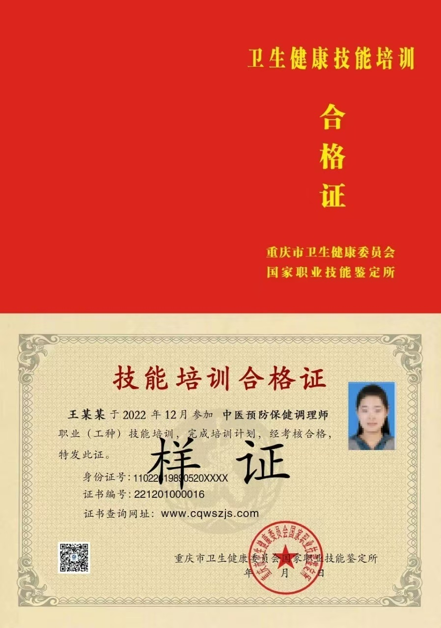 职业证书名称:中医预防保健调理师(重庆卫健委职业鉴定所签发)
